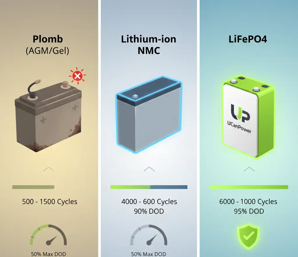 - Batteries LiFePO4 (Lithium Fer Phosphate) : Le top du marché résidentiel. Durée de vie exceptionnelle (6 000 à 10 000 cycles), sécurité accrue (pas de risque d'emballement thermique), profondeur de décharge de 95%. Plus chères mais recommandées pour la fiabilité. Technologie privilégiée par UCanPower par exemple.